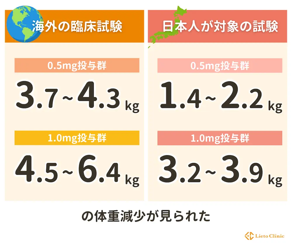 海外で行われた臨床試験では、オゼンピックの有効成分セマグルチド0.5mgを投与した患者の体重が3.7〜4.3kg、セマグルチド1.0mgでは4.5〜6.4kg減少したとの報告があります。